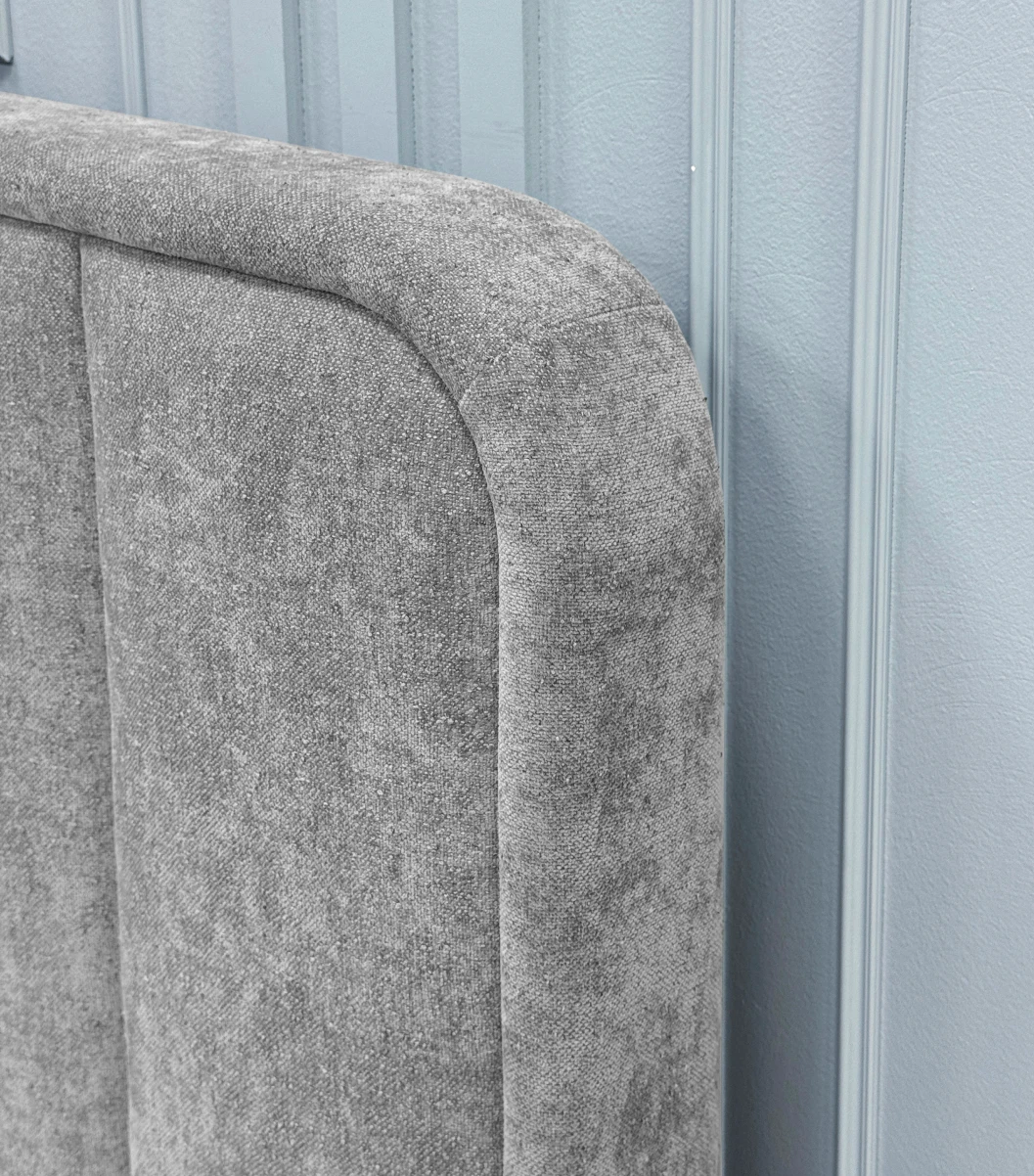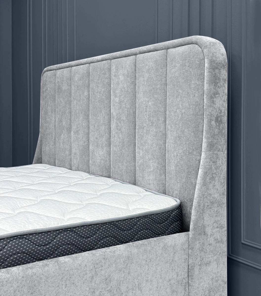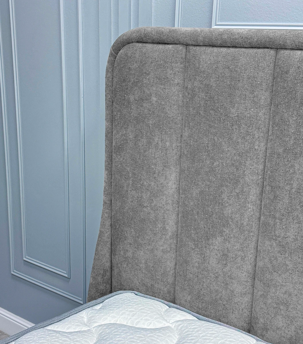 Дизайн изголовья формируется из округлой рамки и отдельных вертикальных вставок, которые изготавливаются и обтягиваются отдельно. Благодаря такому сочетанию все элементы изголовья имеют ярко выраженную выпуклую форму, что придает кровати премиальный внешний вид. Объемные мягкое изголовье