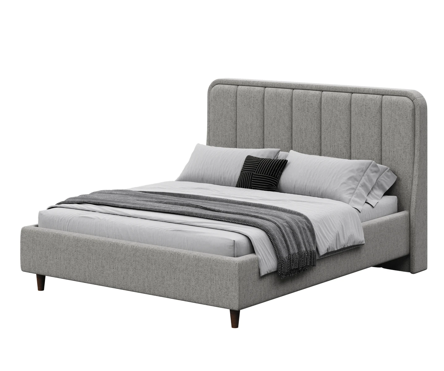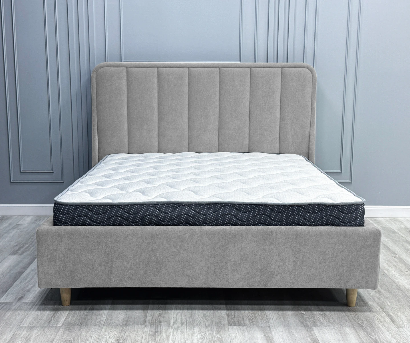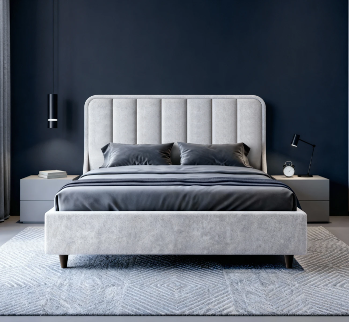 Дизайн изголовья формируется из округлой рамки и отдельных вертикальных вставок, которые изготавливаются и обтягиваются отдельно. Благодаря такому сочетанию все элементы изголовья имеют ярко выраженную выпуклую форму, что придает кровати премиальный внешний вид. Объемные мягкое изголовье